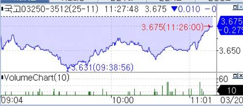 서울 채권시장에 따르면 국고채 3년 지표물 금리는 이날 오전 11시 23분 현재 전일 민평 대비 2.8bp 오른 3.356%에 거래됐다.