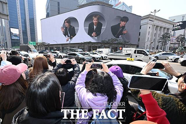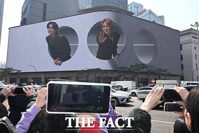 [더팩트 | 김성렬 기자] 그룹 방탄소년단(BTS)의 정규 5집 ‘아리랑’ (ARIRANG)이 발매된 20일 오후 서울 중구 신세계백화점 본점 미디어 파사드 ‘신세계스퀘어’에서 BTS의 ’Swim’ 뮤직비디오가 송출되고 있다.