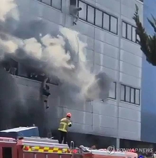 불 난 대전 자동차부품 제조공장 건물 외벽에 매달려 있는 근로자들