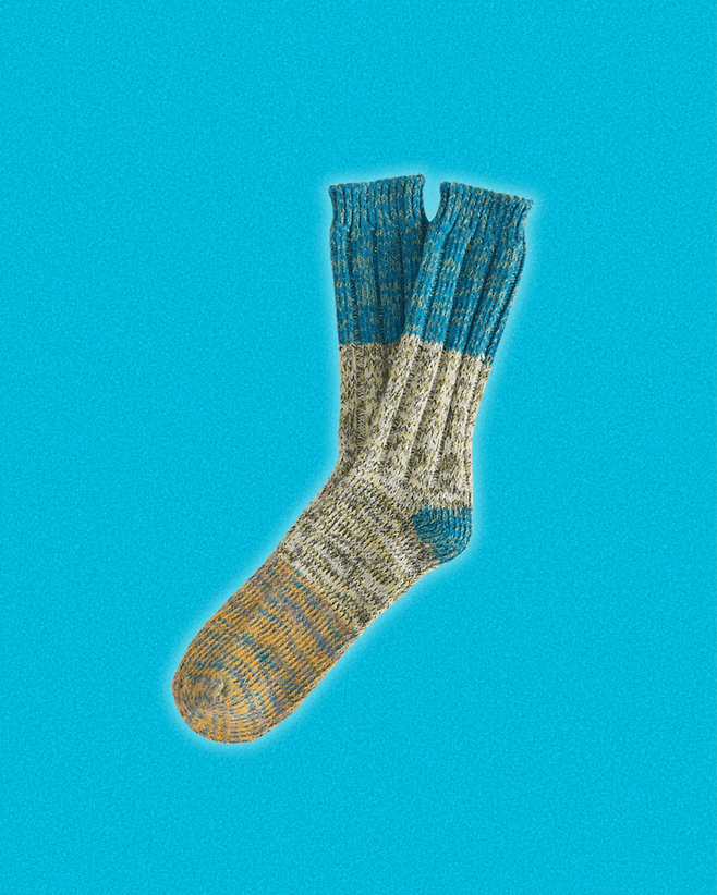 겨울철 시린 발을 보호하기 위해 부드럽고 도톰한 니트 양말은 필수다. 썬더스러브의 양말은 리사이클 울, 코튼 등을 사용해 친환경적인 제작 방식을 고수한다. 파란색, 흰색, 노란색 실을 혼합한 빈틈없는 배색 디자인이 독특한 매력을 뽐낸다. 특히 캐주얼 웨어와 궁합이 좋아 손이 자주 가는 아이템이 될 것.