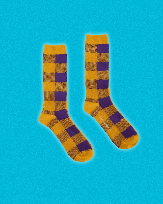 데일리 룩이 지루해졌다면, 패턴 양말로 변화를 주는 것도 좋은 방법이다. 도트, 체크 등 개성 있는 패턴 양말은 신기만 해도 '패잘알'의 반열에 탑승할 수 있는 아이템. 굿마더신드롬의 펑키 체커 삭스는 보라색과 노란색이 강렬한 대비를 이룬다. 자카드 기법으로 체크 패턴에 입체감을 더한 디테일도 놓치지 않았다. 발목 사이로 은근하게 드러나는 체크 패턴이 남다른 패션 센스를 발휘한다.