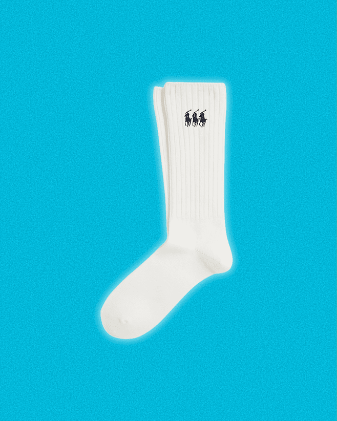 흰 양말은 어느 룩에도 자연스럽게 어울리는 조화로운 아이템이다. 묵직한 레더 재킷과 블루 데님, 그리고 검정 로퍼와 함께 매치해 준다면, 쿨한 매력은 배가 된다. 무거운 분위기는 덜어주고 경쾌함은 더해줄 것. 폴로 랄프 로렌의 양말은 고급스러운 도톰한 짜임과 발목을 감싸는 긴 기장으로 사계절 내내 활용도가 좋다.