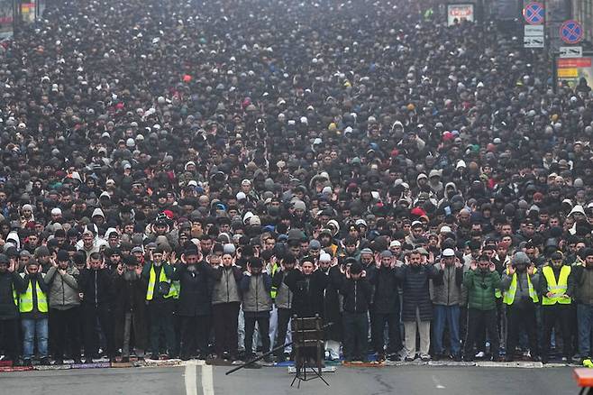 [상트페테르부르크=AP/뉴시스] 20일(현지 시간) 러시아 상트페테르부르크에서 이슬람 금식 성월 라마단 종료를 기념하는 이드 알피트르(Eid al-Fitr)를 맞아 무슬림들이 기도하고 있다. 2026.03.20.