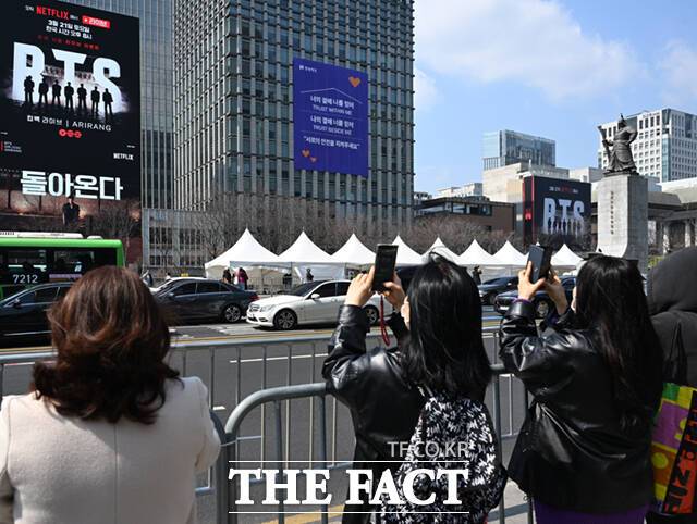 BTS의 이번 공연은 21일 오후 8시 서울 광화문 일대에서 진행되며 넷플릭스가 독점 생중계한다. 무대를 중심으로 숭례문까지 최대 26만 명이 현장을 찾아 공연을 관람할 것으로 예상된다.