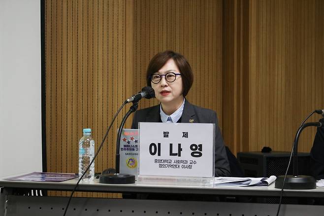 첫 번째로 발제를 맡은 이나영 중앙대 사회학과 교수는 "강남역 여성살해사건은 한국사회에 쌓인 구조적 모순을 여성들이 꿰뚫게 된 현장이자, 개별적 공포가 정치적 의제로 폭발하게 된 사건"이었다고 말했다.