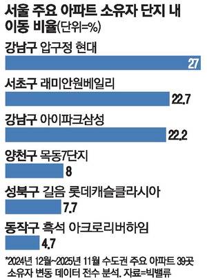 20일 매일경제신문이 데이터테크 기업 빅밸류와 함께 2024년 12월부터 2025년 11월까지 1년간 수도권 주요 아파트 39곳의 소유자 변동 데이터를 전수 분석한 결과에 따르면 핵심지 고가 단지일수록 기존 생활권을 유지한 채 내부에서 자산을 재배치하는 흐름이 뚜렷한 것으로 나타났다.