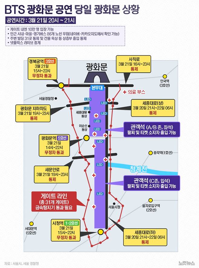 하루 동안 광화문 인근 교통이 통제되고, 근처 지하철역도 무정차하는 등 공연을 즐기기 위해 유의해야 할 점들이 적지 않다. 무엇보다 가장 중요한 건 안전이다. BTS 멤버들도 지난 19일 팬 플랫폼 위버스를 통해 "안전에 꼭 유의해주시길 부탁드린다"고 당부했다.