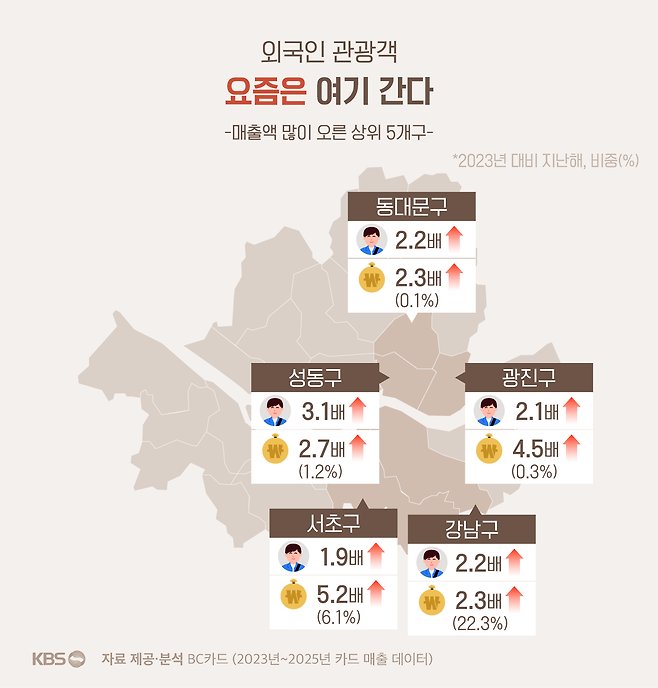 서울 내에서도 성동구를 찾는 사람들이 3.13배, 동대문이 2.21배, 광진구 2.19배 늘어, 기존에 관광객들이 많이 찾았던 중구(1.86배), 강남구(1.6배), 마포구(1.55배), 영등포구(1.32배), 서초구(1.94배)에 비해 증가폭이 더 컸습니다.