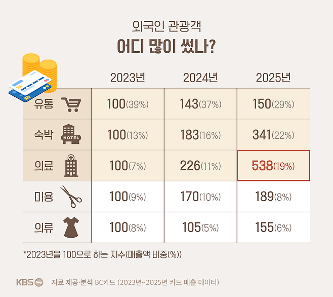 우선이 BC카드 데이터분석팀장은 "전통적으로 백화점이나 면세점 같은 유통 소비가 강세를 이루는 것은 여전하지만 그 외에도 숙박이나 문화· 취미, 의료와 같은 업종이 다양화된 특징이 보이고 있다"고 분석했습니다.