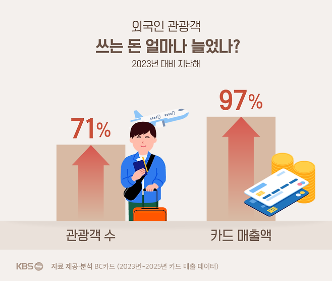 우선 전체 매출 금액은 2023년 대비 97% 올랐습니다. 같은 기간 외래 관광객이 71% 늘어난 것과 비교해 매출은 2배 가까이 뛴 셈이니, 씀씀이도 더 커진 걸로 해석됩니다.