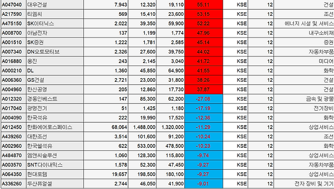 코스피 시장에서는 대우건설이 한 주간 55.11% 오르며 상승률 1위를 기록했다. 티엠씨(53.15%), SK이터닉스(52.22%), 아남전자(47.96%), SK증권(45.14%)도 나란히 급등했다. DN오토모티브(44.02%), 웅진(41.72%), DL(41.55%), GS건설(38.26%), 한신공영(37.87%)도 상승 상위권에 이름을 올렸다. 시장에서는 건설주와 에너지 설비·서비스, 증권주를 중심으로 수급이 몰리며 순환매가 강하게 나타난 것으로 보고 있다.