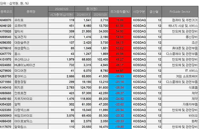 코스닥 시장에서는 우리로가 75.86% 오르며 주간 상승률 1위에 올랐다. 오르비텍(61.56%), 엘티씨(54.90%), 빛과전자(54.66%), 대창솔루션(54.13%), 해성옵틱스(52.62%) 등도 50% 안팎의 급등세를 나타냈다. 핌스(49.88%), 두산테스나(49.27%), HLB이노베이션(49.17%), 미디어젠(44.65%)도 강세를 보였다. 반도체 및 관련 장비, 통신장비, 에너지 설비·서비스 업종으로 매수세가 집중된 영향으로 해석된다.