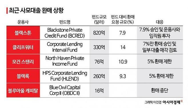 이후 대형 운용사들이 잇따라 인출을 제한했다. 모건스탠리가 운용하는 노스 헤이븐 프라이빗 인컴 펀드(PIF)는 투자자들의 환매 요청이 몰리면서 요청 금액의 약 45.8%(1억6900만달러)만 지급했다. 블랙록도 HLEND 펀드에 대한 환매 신청이 급증하자 인출 한도를 제한했다. 블랙스톤과 클리프워터 등 다른 운용사들도 환매를 제한하거나 지급 규모를 줄이는 등 비슷한 흐름을 보였다.