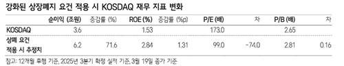권 연구원은 상장폐지 가속화가 현실화하면 코스닥 시장의 자기자본이익률(ROE)은 1.5%에서 2.8%로 상향 조정될 것으로 내다봤다. 그러면서 코스닥의 PER은 173배에서 99배로, PBR은 2.65배에서 2.81배로 각각 조정될 것으로 전망했다.