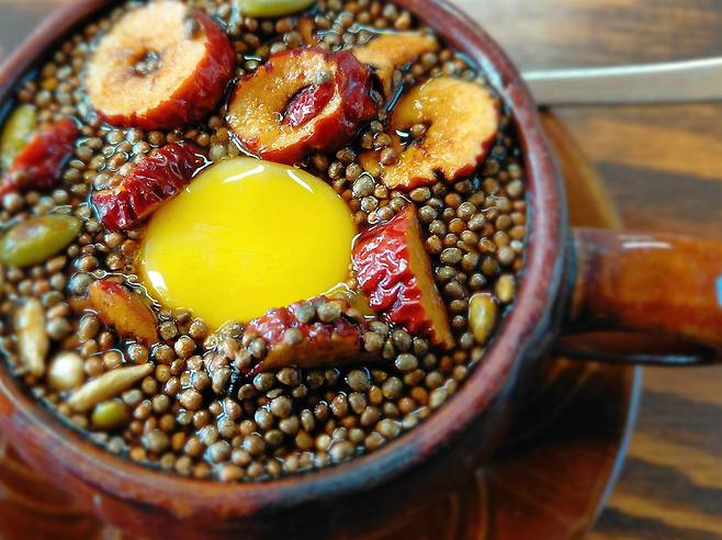 | ▲ 쌍화차 통들깨, 대추, 견과류 사이로 우아하게 뜬 선명한 달걀노른자. 50년 세월이 담겨 있었다. |