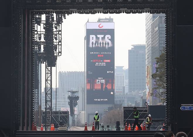 | ▲ BTS(방탄소년단) 컴백 공연을 하루 앞둔 20일 오후 서울 종로구 광화문광장에서 관계자들이 무대 설치와 장비 점검 등 공연 준비로 분주히 움직이고 있다. |