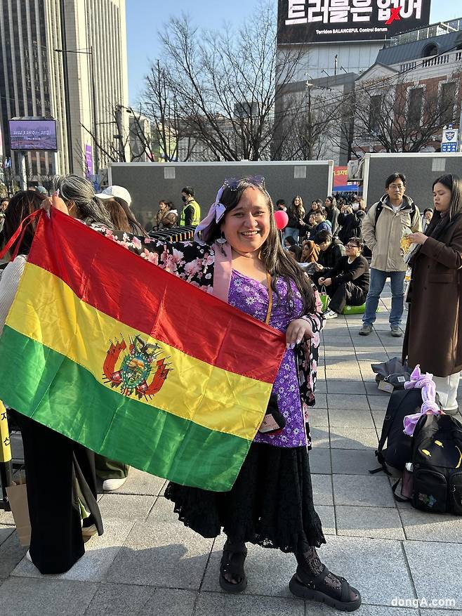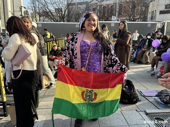 볼리비아에서 온 마호 씨(35)는 자국 전통이 묻어나는 화려한 문양에 보라색을 결합한 의상을 입어 눈길을 끌었다. 그는 볼리비아 국기를 펼쳐 보이며 환하게 웃었다.