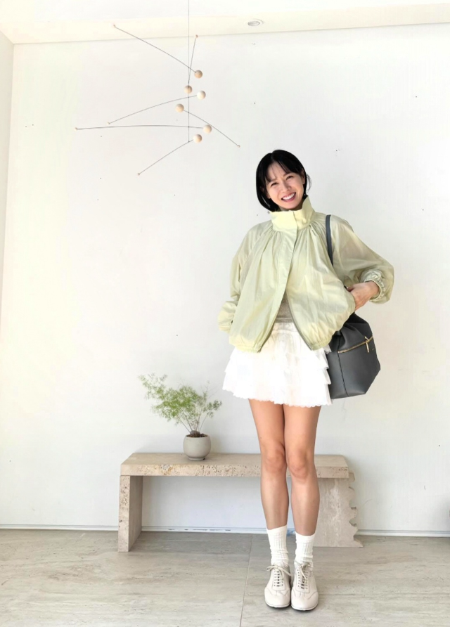 손예진은 21일 자신의 SNS를 통해 일상 사진을 공개했다. 공개된 사진 속 그는 연두빛 점퍼와 화이트 미니스커트를 매치한 채 밝은 미소를 짓고 있다.