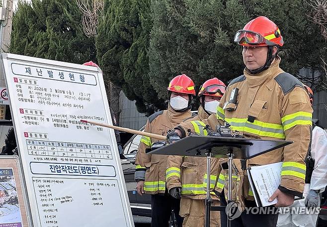 (대전=연합뉴스) 임채두 기자 = 남득우 대전대덕소방서장이 21일 오후 대전 대덕구 자동차부품 제조 공장인 안전공업 앞에서 소방 브리핑을 하고 있다. 2026.3.21