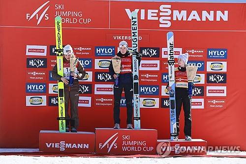 epa12838157 (L-R) Second placed Frida Westman of Sweden, winner Eirin Maria Kvaldal of Norway, and third placed Nika Prevc of Slovenia smile on the podium after the Women's Flying Hill HS240 at the FIS Ski Jumping World Cup stop in Vikersund, Norway, 21 March 2026. EPA/Trond R Teigen NORWAY OUT