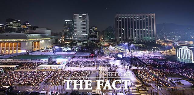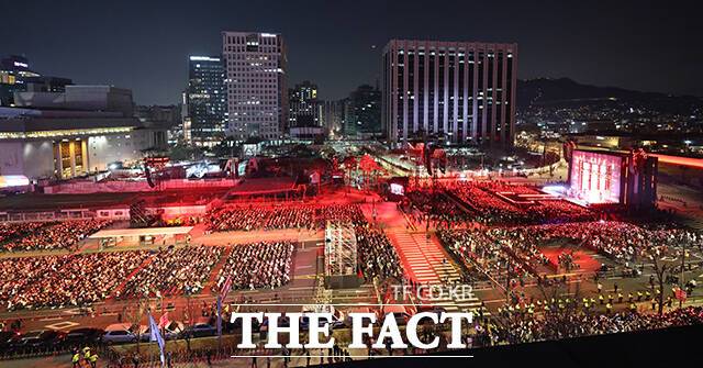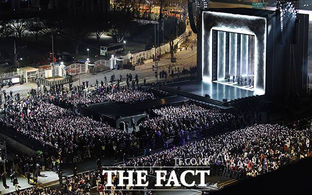 [더팩트ㅣ배정한 기자] 그룹 방탄소년단(BTS)이 21일 오후 서울 광화문 광장에서 정규 5집 '아리랑(ARIRANG)' 앨범 발매를 기념해 마련된 컴백 무대에 올라 화려한 퍼포먼스를 선보이고 있다.