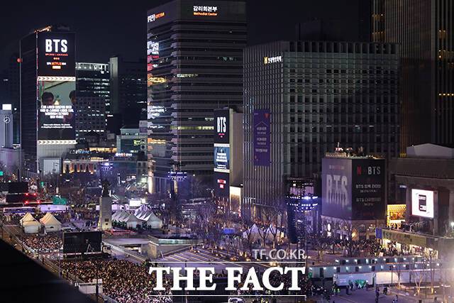 완전체로 신곡 선보이는 BTS…'보라빛 함성 가득한 광화문' [TF사진관]