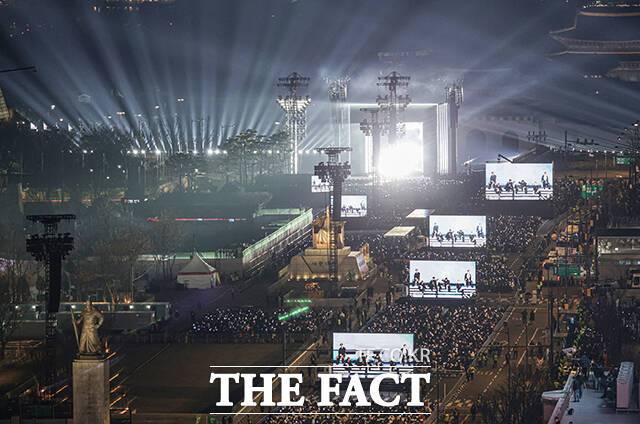 [더팩트ㅣ배정한 기자] 그룹 방탄소년단(BTS)이 21일 오후 서울 광화문 광장에서 정규 5집 '아리랑(ARIRANG)' 앨범 발매를 기념해 마련된 컴백 무대에 올라 화려만 퍼포먼스를 선보이고 있다.