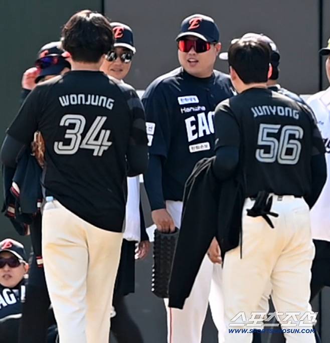 21일 부산 사직야구장에서 열린 한화 이글스와 롯데 자이언츠의 시범경기, 경기 전 외야 그라운드에서 훈련 중인 한화 선수단의 모습이 눈길을 끌었다.