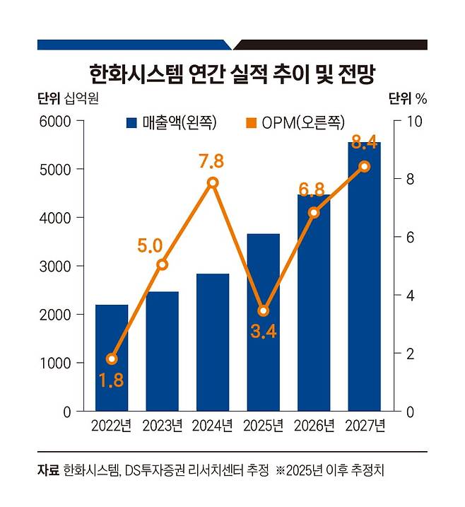 증권가에서는 올해 실적 개선 가능성도 높게 보고 있다. 키움증권은 한화시스템의 올해 매출을 4조4314억원으로 전망했다. 전년 대비 20.9% 증가한 규모다. 영업이익은 3450억원으로 179.3% 늘어날 것으로 예상된다. 방산 부문에서 중동 수출이 확대되고 레이더 양산 납품이 시작되면서 수익성이 개선될 것으로 분석된다. 이동헌 신한투자증권 연구원은 “한화시스템이 지분 60%를 보유한 필리조선소가 지난해 적자가 지속됐으나 올해 흑자전환이 예상된다”며 “미국과 협력해 차입을 통한 투자도 가능해 감가상각비 증가 부담은 크지 않을 것”이라고 내다봤다. 이어 “전년보다 매출과 이익은 증가하겠지만 비용 측면에서는 자체 투자비가 늘면서 마진율이 일부 영향을 받을 수 있다”며 “한화시스템 본사의 성과급도 실적의 일부 변수가 될 수 있다”고 했다.