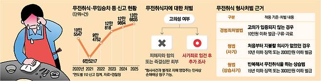 상습적으로 무전취식을 하는 이들도 처벌 규정을 대수롭지 않게 여긴다. 지난 1월 상습사기 혐의로 경찰에 붙잡힌 60대 남성 C씨가 단적인 사례다. C씨는 지난 1월 18일 오전 7시 30분께 제주시 내 한 음식점에서 9만7000원 상당의 술과 음식을 먹은 뒤 담배를 사러 간다는 핑계로 계산하지 않고 도망갔다. 같은 날 오전 11시 30분께 C씨는 또 다른 음식점에서 무전취식을 하려다 때마침 해당 음식점에 식사하러 들른 경찰에 의해 현행범으로 체포됐다. 경찰에 검거된 당시 최근 1년간 C씨 앞으로 신고된 무전취식 신고 이력은 12건에 달했다.