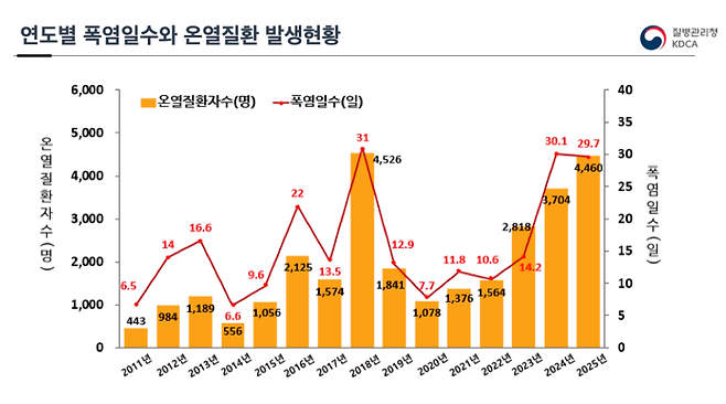질병관리청 집계에 따르면 2018년부터 2025년까지 지난 8년간 발생한 온열질환자는 2만 1,352명, 사망자는 192명에 이릅니다. 특히 2025년 전국의 온열질환자는 4,460명으로 폭염이 가장 잦았던 2018년에 이어 두 번째로 많았습니다. 황승식 서울대 보건대학원 교수는 "지난 10년간 국내 자연재해 사망 원인 1위는 폭염이었다."며 "2위인 호우와 비교해 2배 이상 많았다."고 말했습니다.