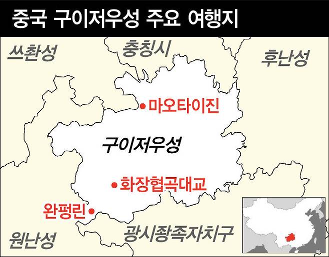 구이저우성엔 ‘맑은 날이 3일 이어지지 않고, 평평한 땅이 3리도 안 되며, 사람들에게 3푼의 돈이 없다’(天無三日晴 地無三里平 人無三分銀)란 말이 있다. 하지만 이제 옛말이 됐다. 맑지 않아도 높은 데서 해를 영접하고, 평평하지 않아도 유채꽃밭이 만든 평원이 있으며, 마오타이주로 쌓은 부가 사람들 주머니를 채우는 곳이 구이저우성이다.