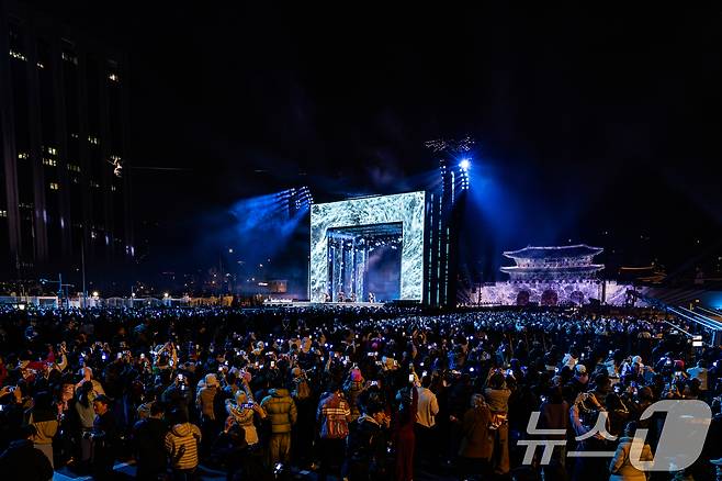 (서울=뉴스1) = 방탄소년단(BTS)이 21일 서울 광화문광장에서 'BTS 컴백 라이브: 아리랑' 발매 기념 컴백 공연을 하고 있다. (빅히트 뮤직·넷플릭스 제공. 재판매 및 DB 금지) 2026.3.22/뉴스1