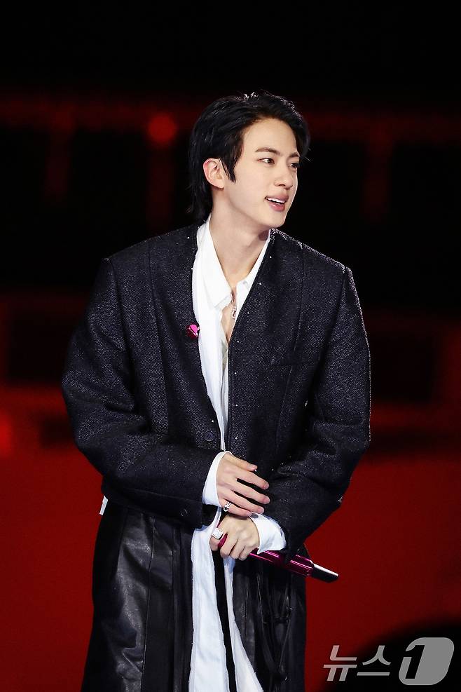 (서울=뉴스1) = 방탄소년단(BTS) 진이 21일 서울 광화문광장에서 'BTS 컴백 라이브: 아리랑' 발매 기념 컴백 공연을 하고 있다. (빅히트 뮤직·넷플릭스 제공. 재판매 및 DB 금지) 2026.3.22/뉴스1