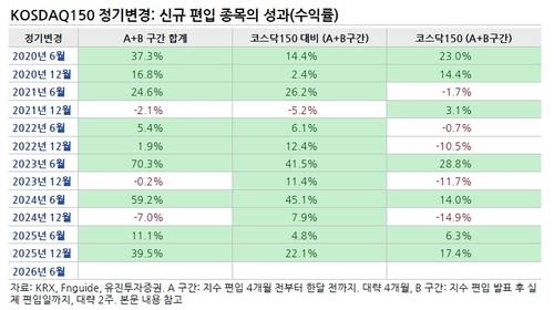 특히 코스닥150의 경우, 2020년 이후 작년까지 총 12번의 정기 변경 중 지수 편입 4개월 전부터 실제 편입일까지의 구간에서 신규 편입 종목의 주가가 하락한 것은 3번(2021년 12월, 2023년 12월, 2024년 12월)뿐이었다. 주가 하락 폭도 -5% 미만이나 내외로 크지 않았다.