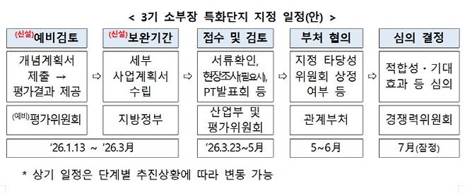 산업부는 내달 4월 1일 개최 예정인 3기 특화단지 사업설명회에서, 예비검토 과정에서 제시된 주요 컨설팅 사항을 지방정부에 공유할 예정이다. 이를 거쳐 오는 7월까지 부처 협의 및 심의를 거쳐 3기 소부장 특화단지 지정을 할 예정이다.