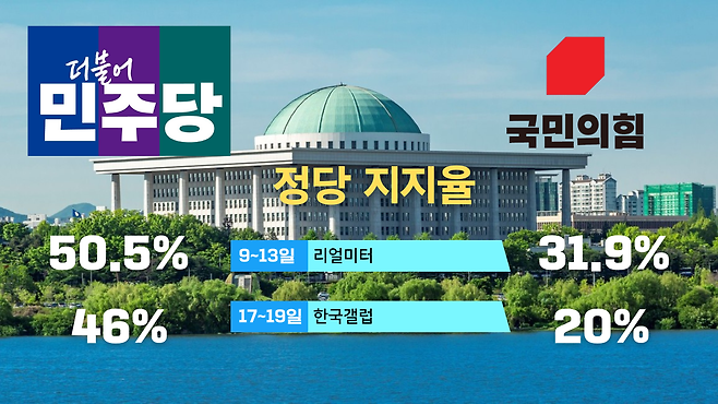 정당지지도, 갤럽 민주 46% vs 국힘 20%, 리얼미터 민주 50.5% vs 국힘 31.9%