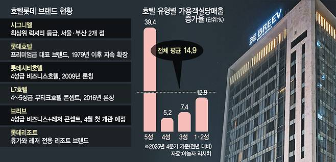 이는 최근 호텔 시장에서 특색 없는 4성급 호텔의 인기가 점점 줄어드는 추세에 대응한 것이다. 야놀자리서치에 따르면 지난해 4분기 국내 5성급 호텔의 가용 객실당 매출(RevPAR)은 전년 같은 기간보다 39.6% 성장한 반면, 4성급 호텔은 5.2% 성장에 그쳤다. 전체 숙박시설의 평균 성장률(14.6%)에도 미치지 못했으며 1~2성급 호텔의 성장률(12.9%)보다도 낮았다. 롯데호텔 관계자는 “개성 없고 가격대도 어중간한 호텔에 대한 소비자들의 선호도가 낮아지고 있는 것”이라며 “부티크 호텔 브랜드인 L7과 브리브처럼 콘셉트가 명확한 브랜드가 시장에서 호응을 받을 것으로 보고 있다”고 말했다.