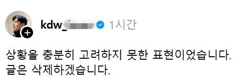 이에 김동완은 "상황을 충분히 고려하지 못한 표현이었습니다. 글은 삭제하겠습니다"라며 뒤늦게 자신의 글을 지웠다.