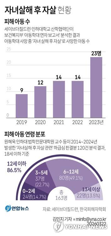 (서울=연합뉴스) 김민지 기자 = 22일 한국피해자학회 학술지 '피해자학연구'에 게재된 '자녀살해 후 자살 사건의 실태 및 대책' 연구보고서를 보면, 피해 아동 대부분은 12세 이하 영·유아와 아동인 것으로 나타났다.