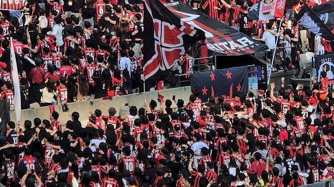 이날 경기의 진짜 하이라이트는 골이 아니라 ‘응원’이었다. 서울 팬들은 무려 세 차례 ‘포즈난 응원’을 펼쳤다. 포즈난 응원은 유럽에서 시작된 응원 문화로, 팬들이 경기장을 등지고 점프하며 노래를 부르는 것이 특징이다. 팀의 승리를 확신할 때 등장하는 상징적인 장면이다. 남은 시간 더 이상 경기를 볼 필요도 없이 이겼다는 의미였다.