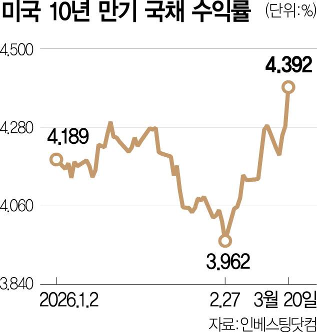미국·이스라엘과 이란 전쟁의 장기화 우려가 커지는 가운데 유가 변동성 증폭에 따라 국채 가격이 급락하며 전 세계 금융시장이 요동치고 있다. 미국 10년물 국채금리는 지난해 8월 이후 최고 수준으로 상승했고 국내 시장금리 역시 상방 압력을 받으며 신용 스프레드(AA-급 회사채 3년물과 국고채 금리 차)가 60bp(bp=0.01%포인트) 이상까지 확대됐다.