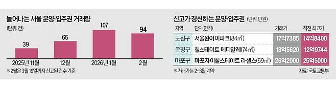 올해 1~2월 서울 아파트 분양권과 입주권 거래 규모가 지난해 말보다 두 배가량 늘어난 것으로 나타났다. 새 아파트 공급은 줄어들고 청약 문턱은 높아진 상황에서 ‘새 아파트에 들어갈 권리’에 대한 관심이 커졌다는 분석이 나온다. 기존 재개발·재건축 조합원이 보유한 입주권은 시공 과정에서 공사비가 늘어날 경우 추가 분담금을 내야 할 수 있어 주의가 필요하다고 전문가들은 조언했다.