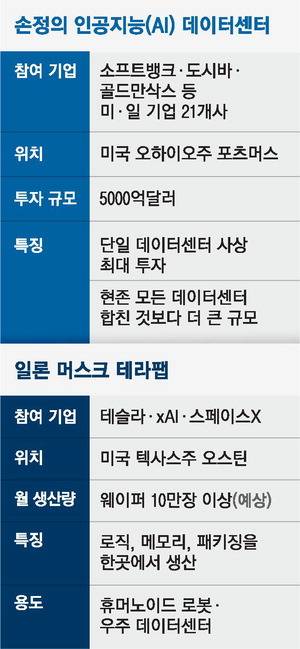 손정의 일본 소프트뱅크그룹 회장이 20일(현지시간) 미국 오하이오주에 5000억달러(약 753조원) 규모의 초대형 인공지능(AI) 데이터센터를 건설하는 계획을 발표했다. 하루 뒤 일론 머스크 테슬라 최고경영자(CEO)는 AI 칩을 자체 생산하는 초대형 공장 '테라팹(TerraFab)' 구축을 선언했다.