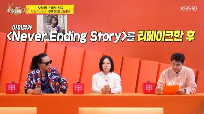 최근 아이유가 '네버 엔딩 스토리'를 리메이크 한 데 대해선 "아이유 덕분에 1분기에만 저작권료가 1억이나 들어왔다"고 고백했다. 김태원은 또 아이유를 향해 "반가워, 친구. 리메이크해줘서 고맙다"며 영상편지를 보내 거듭 인사를 전했다.