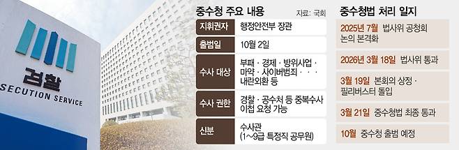 검찰청 폐지 이후 기존 검찰의 수사 기능을 넘겨받게 될 중대범죄수사청 설치법이 이달 21일 더불어민주당 주도로 국회 본회의를 통과했다. 올 10월 중수청이 출범하면 1948년 정부 수립과 함께 설립된 검찰청은 78년 만에 해체 수순을 밟게 된다. 다만 중수청 수사에 대해 공소청에 의무적으로 통보하도록 하는 조항이 삭제되면서 외부 감독과 통제가 사실상 어려워졌다는 지적이 나온다. 여기에 행정안전부가 경찰과 국가수사본부에 이어 중수청까지 관할하게 되면서 수사권 집중 우려도 커지고 있다.