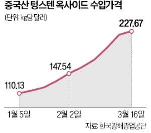 한국광해광업공단에 따르면 지난 19일 기준 중국산 텅스텐옥사이드 가격은 ㎏당 227.47달러를 기록했다. 전쟁 발발 직전인 지난달 말(183.06달러)과 비교하면 한 달여 만에 24% 이상 급등한 수치다.