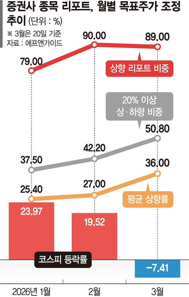 특히 1~2월 상승장과 비교해도 목표주가 조정 폭은 오히려 확대된 것으로 나타났다.