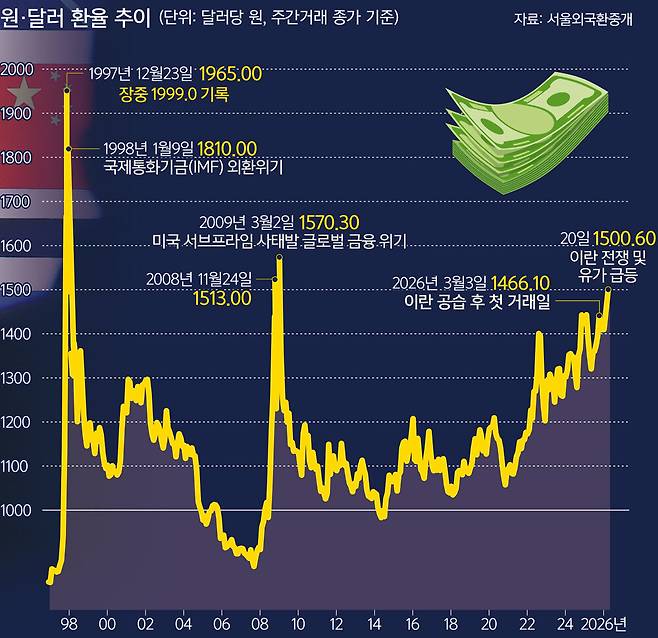 이란전쟁으로 원·달러 환율이 이틀 연속 1500원을 돌파하면서 이달 평균 환율이 국제통화기금(IMF) 구제금융이 한창이던 1998년 수준에 다가섰다. 금융 소비자들이 체감하는 은행 영업점 환율은 이미 1570원까지 뛰었다. 1500원 안팎의 고환율이 ‘뉴노멀’(새 표준)이 되면서 물가 상승과 금리 인상 우려가 커지고 있다.