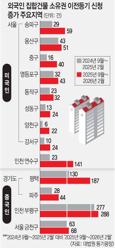 수도권에서 외국인의 주택 매수 시 실거주 2년 의무 규제가 적용된 이후 외국인 매수세 양대 축인 미국인과 중국인의 아파트 매수가 일부에선 오히려 늘어난 것으로 나타났다. 자금력 있는 외국인이 특정 지역에 매수를 집중한 ‘똘똘한 한 채’ 현상으로 해석된다.